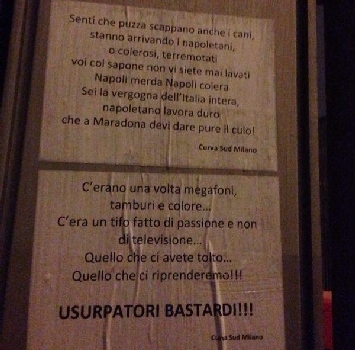 Nella notte tra venerdì e sabato gli ultras rossoneri hanno tappezzato San Siro di 3000 manifesti con il coro anti-Napoli che ha causato la squalifica. Non basta, perché nella prevista manifestazione all'esterno del Meazza durante la partita le cose sono andate pure peggio